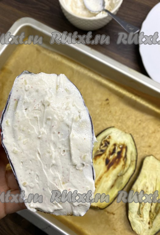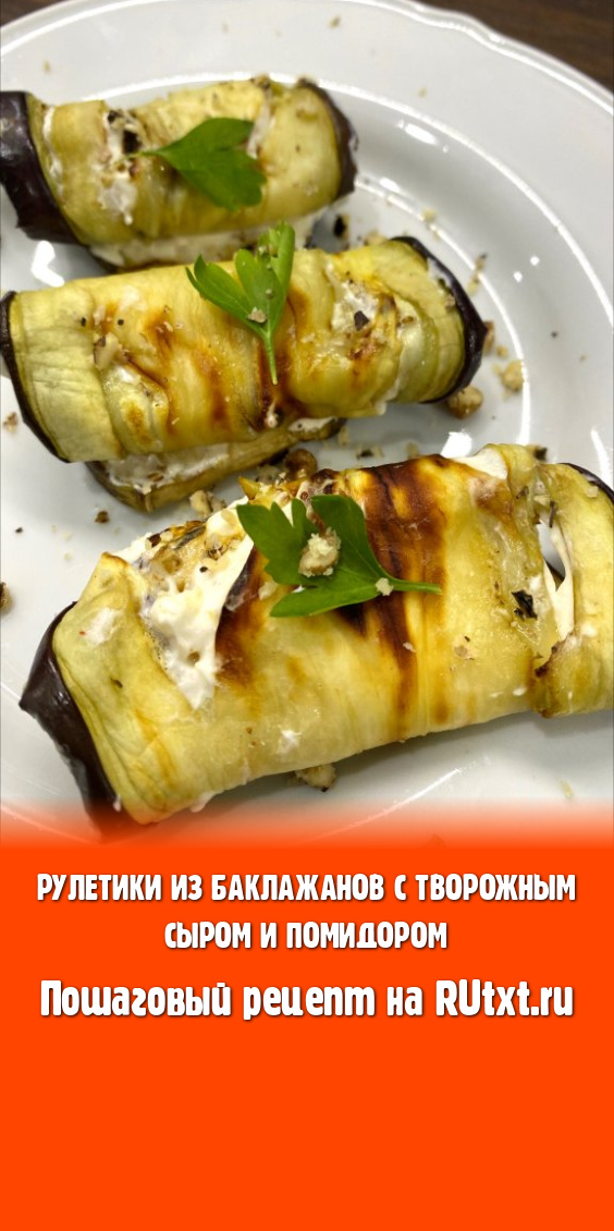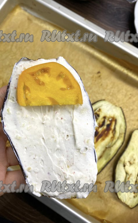 Достать пластины баклажанов из духовки, дать им немного остыть. В это время нарезать помидор на тонкие ломтики. Когда запечённые баклажаны остынут, смазать каждую полоску с одной стороны смесью творожного сыра и чеснока.