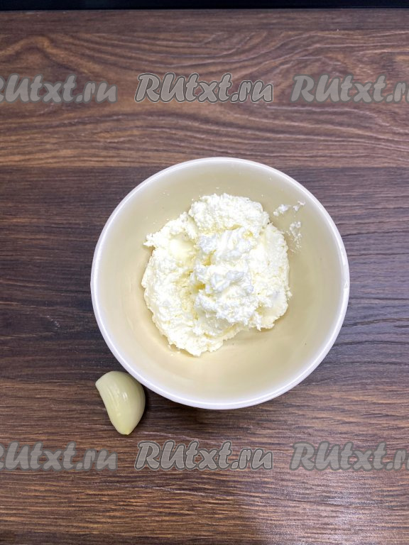 Пока духовка разогревается, творожный сыр смешать с выдавленным через пресс чесноком. Если хотите, можно добавить мелко порубленную зелень (например можно добавить петрушку, укроп).