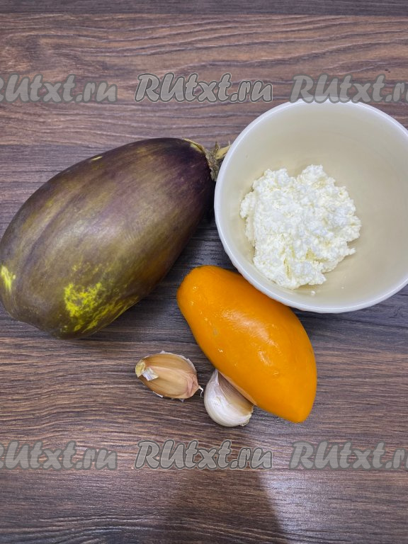 Подготовить ингредиенты. Я взяла жёлтый помидор, подойдёт и красный помидорчик. Количество чеснока можете регулировать в зависимости от остроты, которую вы любите. Творожный сыр я использовала со сливочным вкусом, без добавок. Баклажан и помидор вымыть. Очистить чеснок.