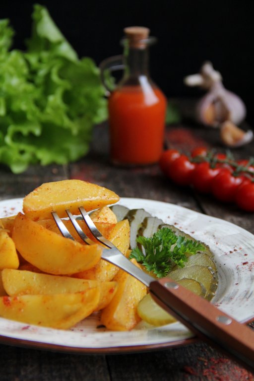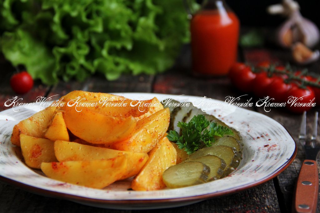Подать картофельные дольки в горячем виде, дополнив соленьями. Кстати, такая картошечка станет и прекрасным гарниром к мясу, рыбе, а ещё её можно готовить в Пост.