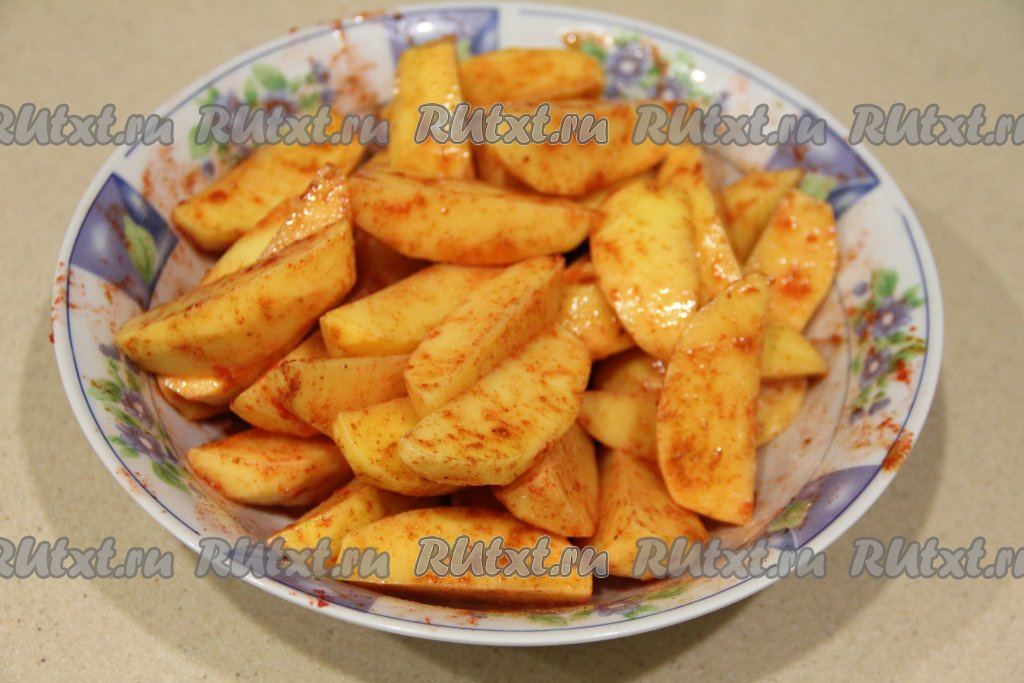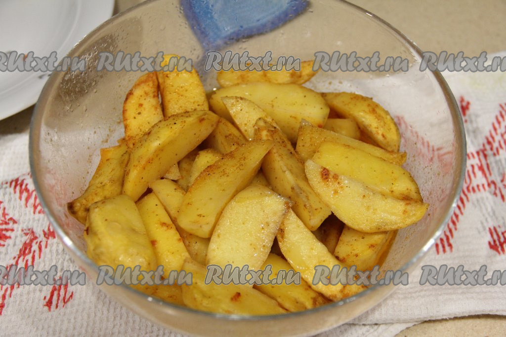 Перемешать картошку с маслом и специями, покрывая дольки со всех сторон.