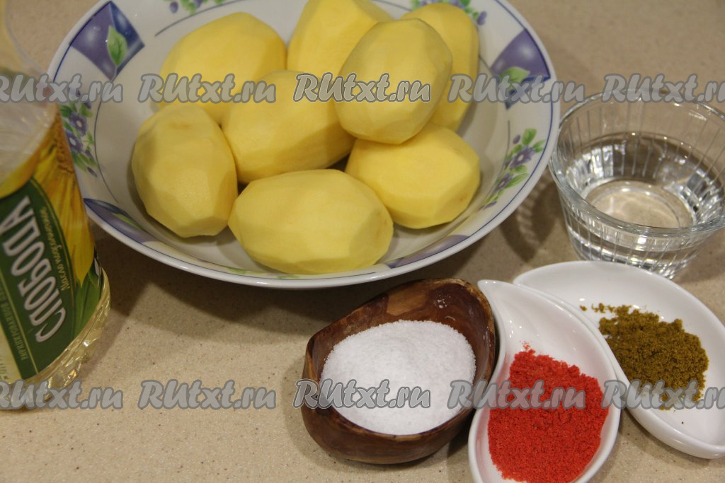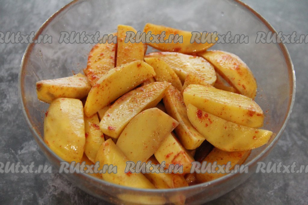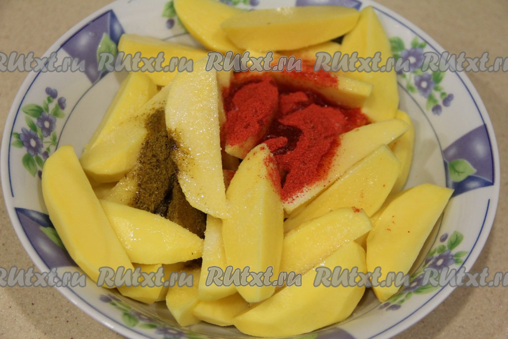 Нарезать картошку на крупные дольки, переложить в глубокую миску, добавить соль, хмели-сунели и паприку, влить масло.