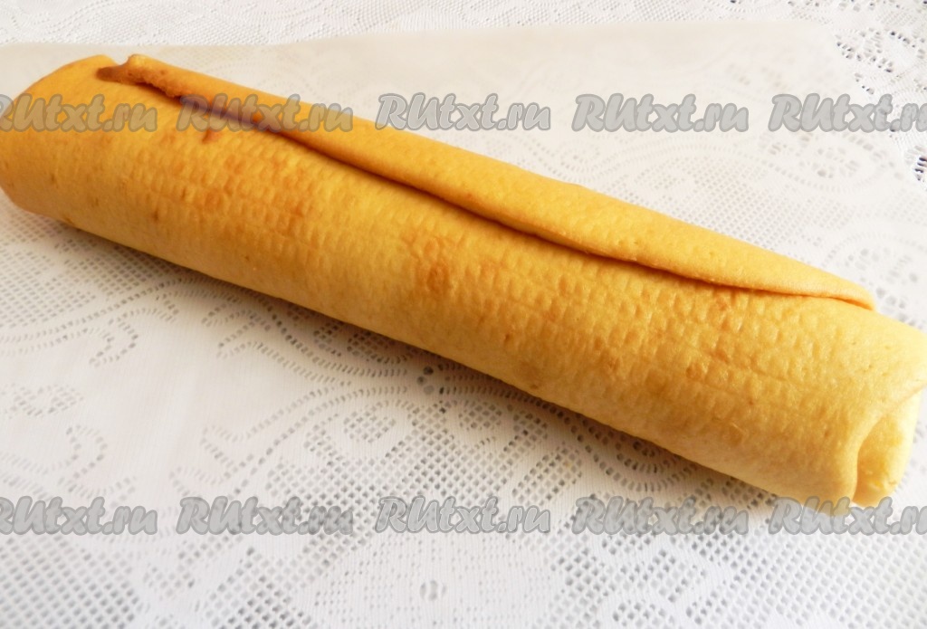 Готовый корж аккуратно перевернуть на чистое полотенце и скрутить рулетом вместе с полотенцем. Оставить бисквитный рулет остывать, затем полотенце убрать.