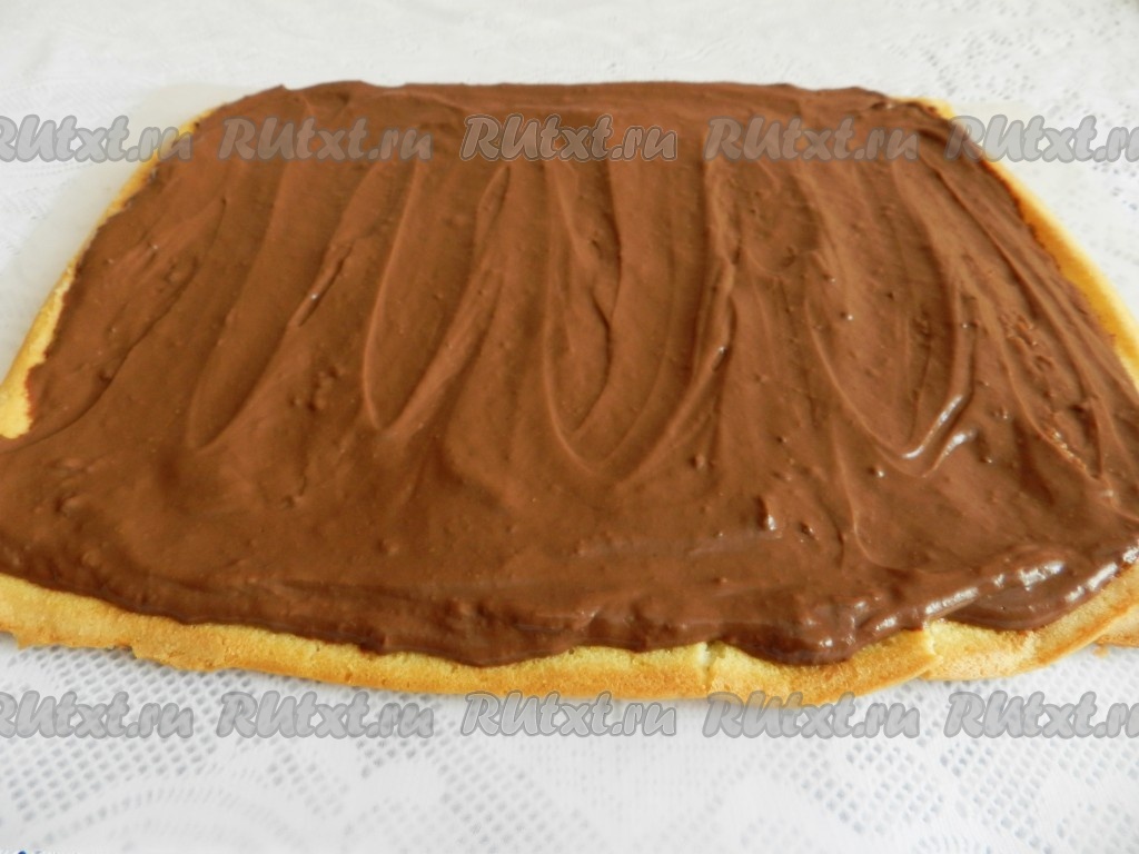 Бисквитный корж развернуть, смазать кремом.