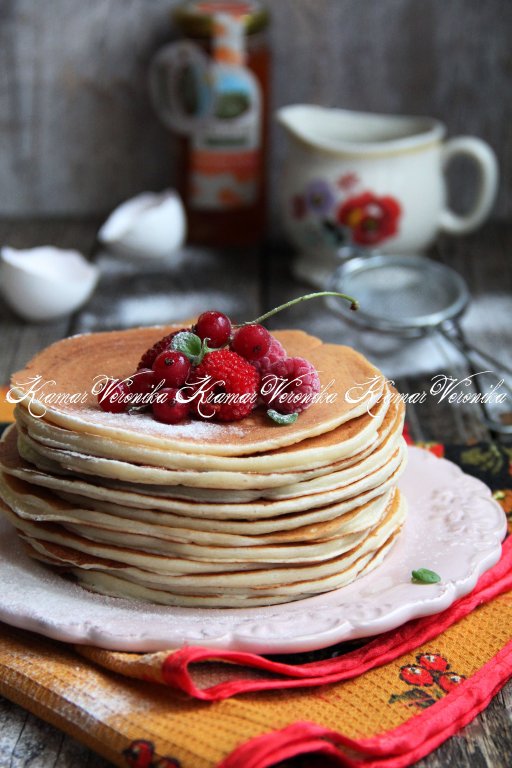 Очень вкусные, нежные творожные панкейки подать к столу, дополнив мёдом, сметаной или сиропом.
