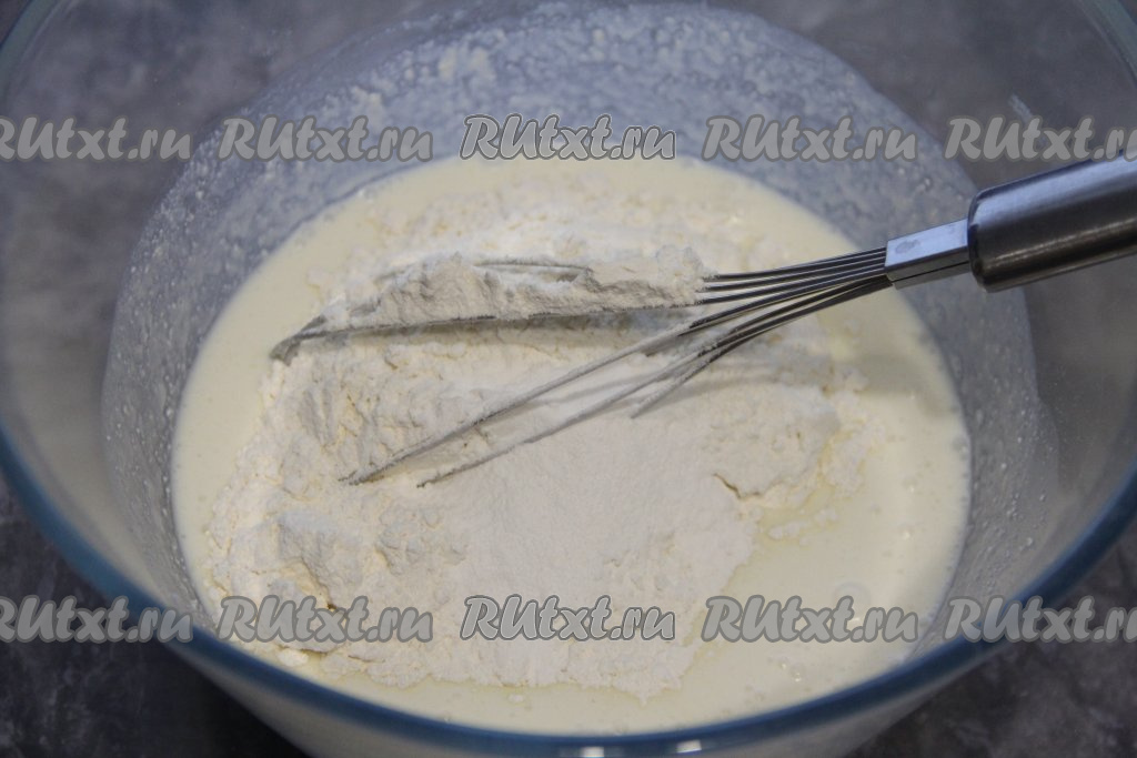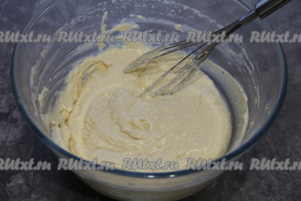 Всыпать муку, соль и разрыхлитель, перемешать творожное тесто венчиком.