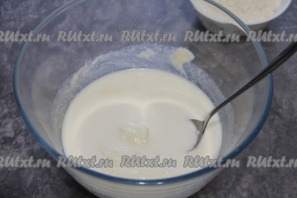 Перемешать массу столовой ложкой, влить молоко и снова перемешать венчиком до однородности.