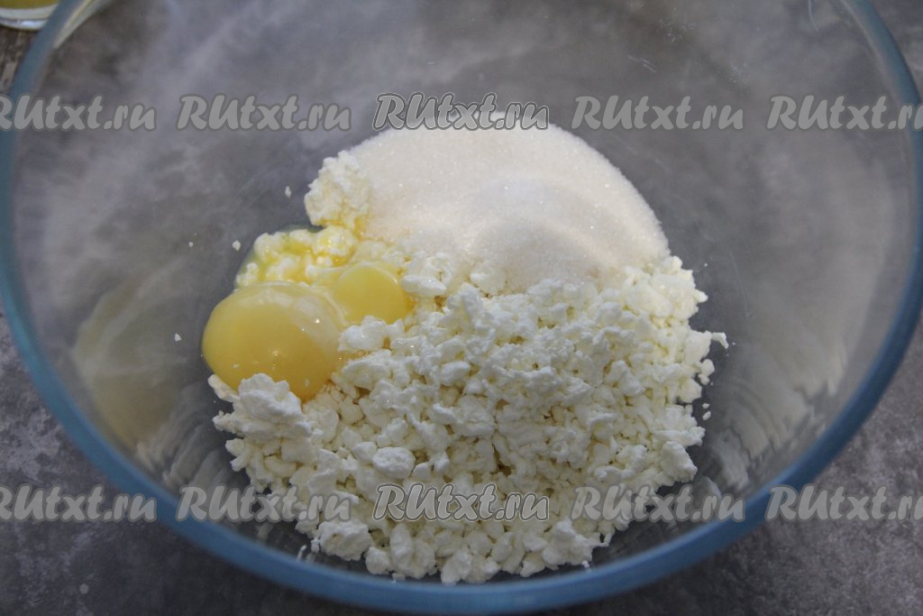 В объёмной миске соединить творог, сахар, ванильный сахар и желтки.