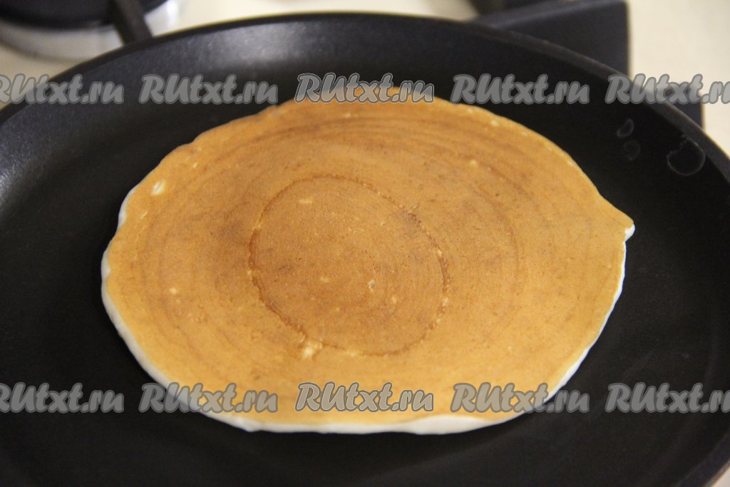 Сковороду хорошо разогреть. Обычно панкейки жарят на сухой раскалённой сковороде. Если же не уверены в качестве покрытия вашей сковородки, тогда слегка смажьте её маслом. В центр раскаленной сковороды выложить 2 столовых ложки теста и сформировать круглый панкейк.