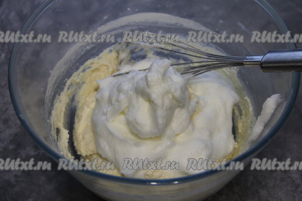 Охлаждённые белки взбить миксером до стойких пиков и добавить в тесто. Аккуратно вмешать белки с помощью венчика в творожное тесто.