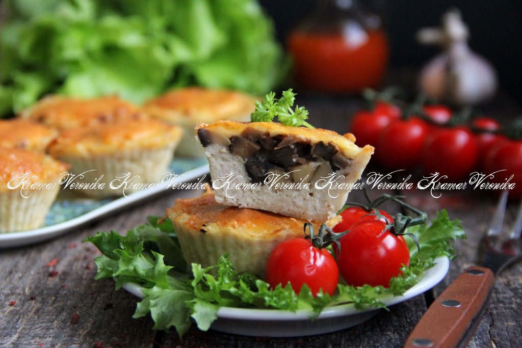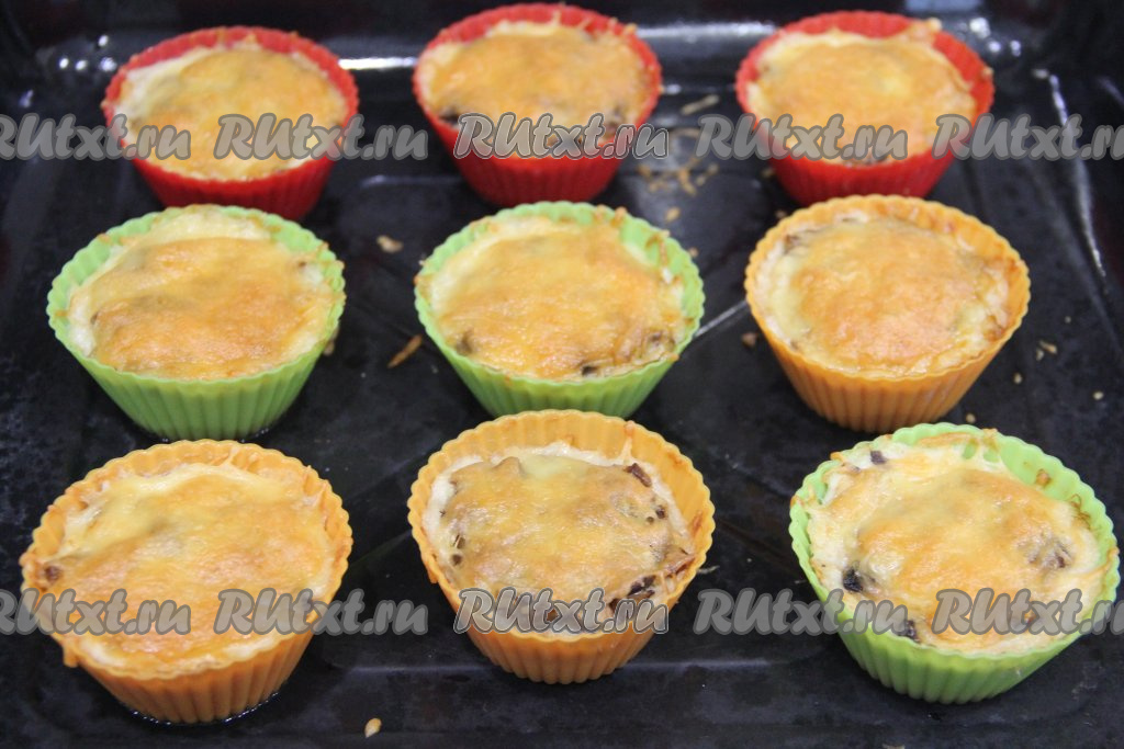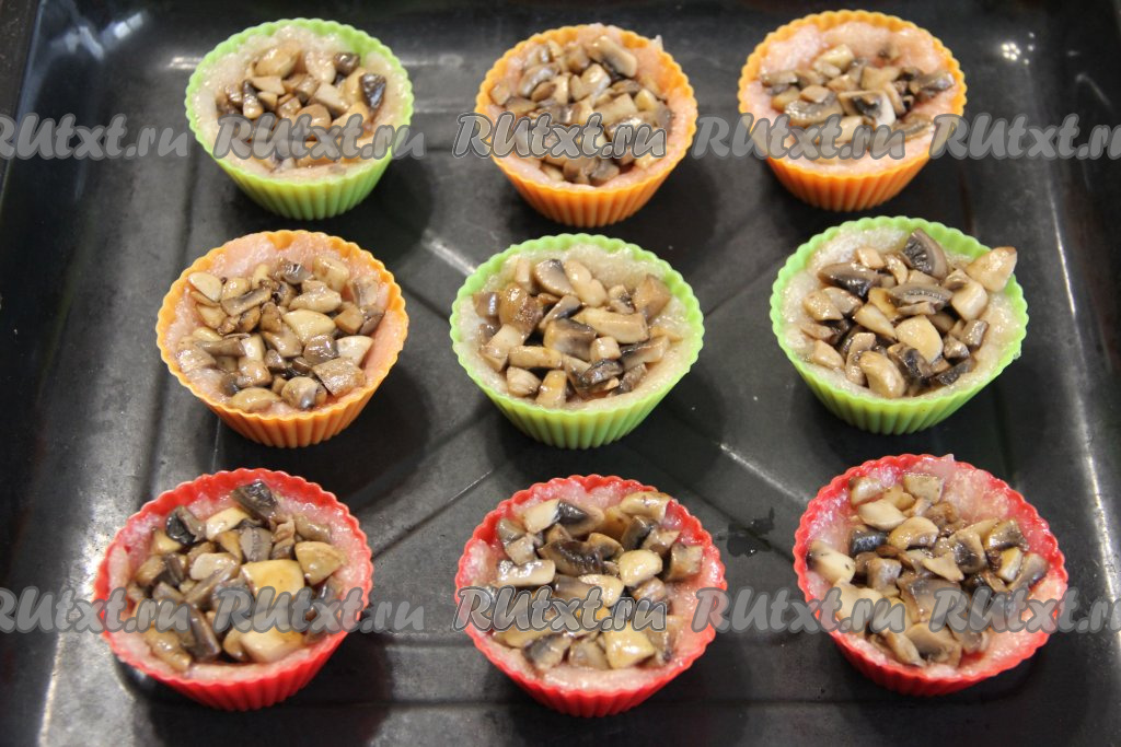 Поставить формы с фаршем на противень. Разложить грибную начинку по корзинкам поверх фарша.