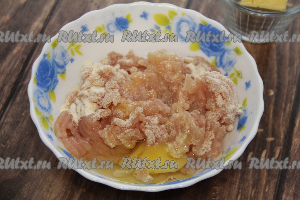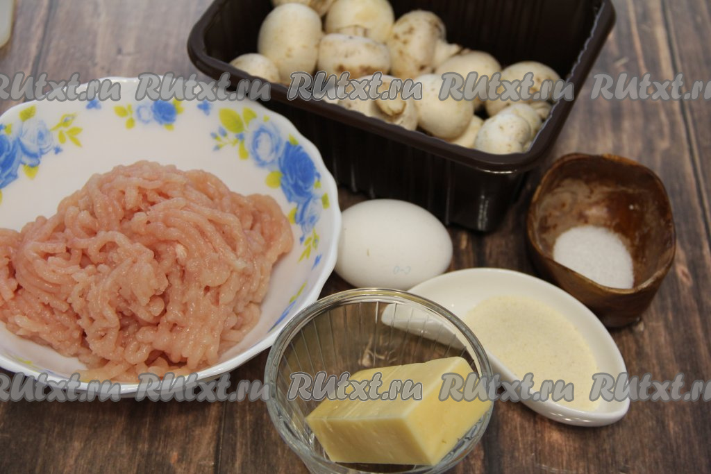 Подготовить продукты. Я готовила с шампиньонами, их нужно промыть водой, убирая с них грязь. Можно взять и лесные грибы, только их нужно предварительно отварить в течение 25-30 минут. Для получения фарша пропустить кусочки мяса (я взяла куриное филе) через мясорубку.
