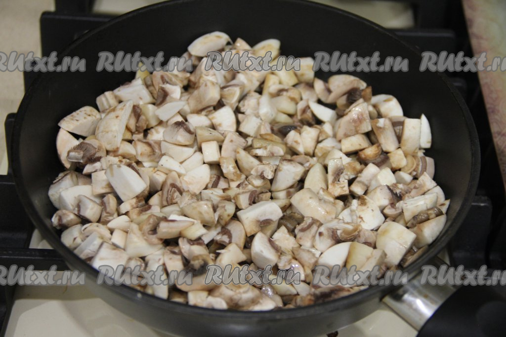 В сковороду влить масло, разогреть. Шампиньоны (или отваренные лесные грибы) мелко нарезать. Добавить грибы в сковороду с маслом.