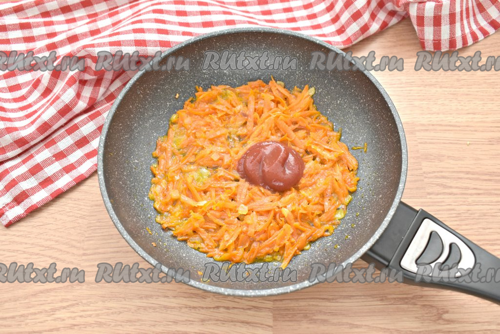 К луку и морковке добавляем томатную пасту, вливаем 2-3 столовых ложки бульона из кастрюли, перемешиваем и тушим овощи 3-4 минуты.