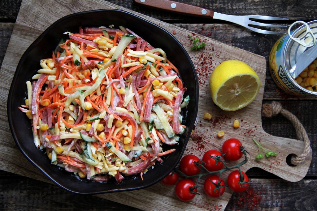 Салат, приготовленный с корейской морковью, сыром, кукурузой, копчёной колбасой и свежим огурцом, получается и сытным, и вкусным. Это блюдо украсит стол и в будни, и в праздники!