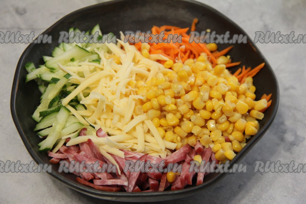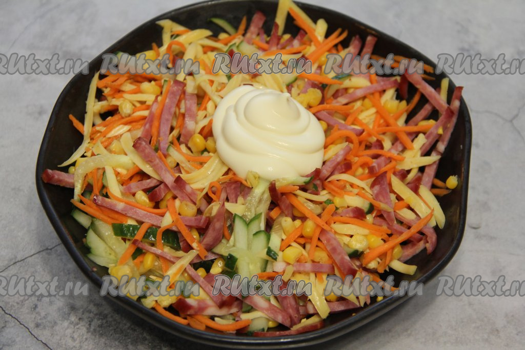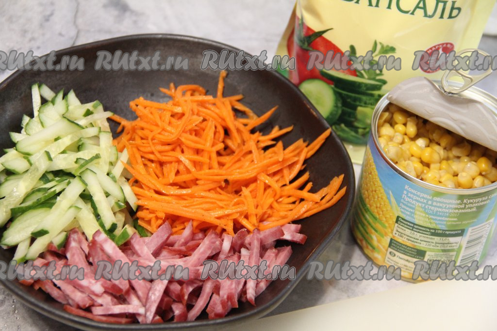 Салат с корейской морковью, копчёной колбасой и свежим огурцом