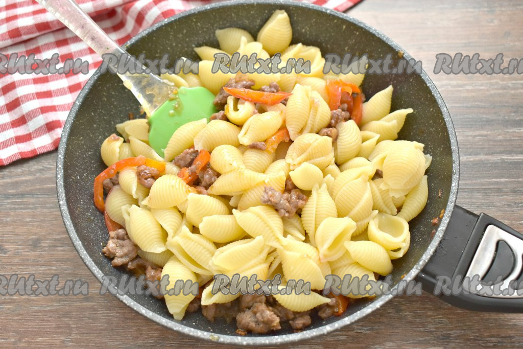 Откидываем отваренные макароны на дуршлаг, давая полностью стечь воде. Макароны перекладываем на сковороду к мясному фаршу, обжаренному с болгарским перцем, перемешиваем, томим под крышкой минуты 3, за это время блюдо можно пару раз перемешать.