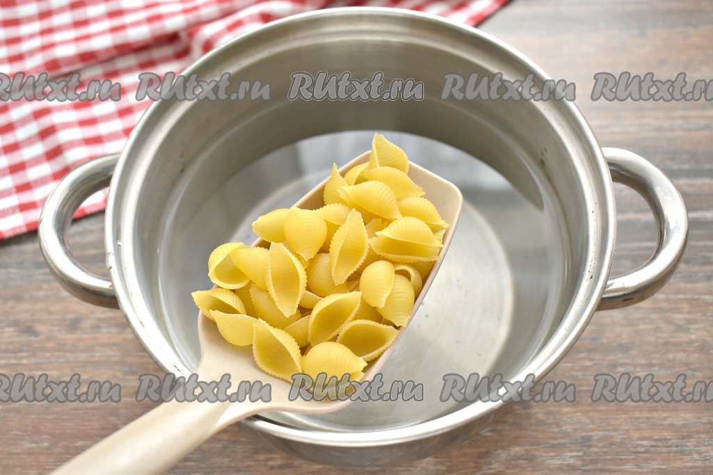 В кастрюлю наливаем 2 литра воды, солим её, ставим на огонь и доводим до кипения. В кипящую воду кладём макароны и сразу перемешиваем. Варим макароны до готовности, периодически перемешивая (макароны бывают разными, я варила 10 минут, но точное время варки нужно смотреть на упаковке макаронных изделий, которые вы варите).