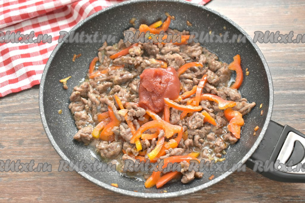 После этого в сковороду добавляем томатную пасту, вливаем 2-3 столовых ложки воды из кастрюли, в которой варятся макароны. Тушим под крышкой фарш с перцем 7-8 минут на малом огне (до готовности фарша), иногда перемешивая.