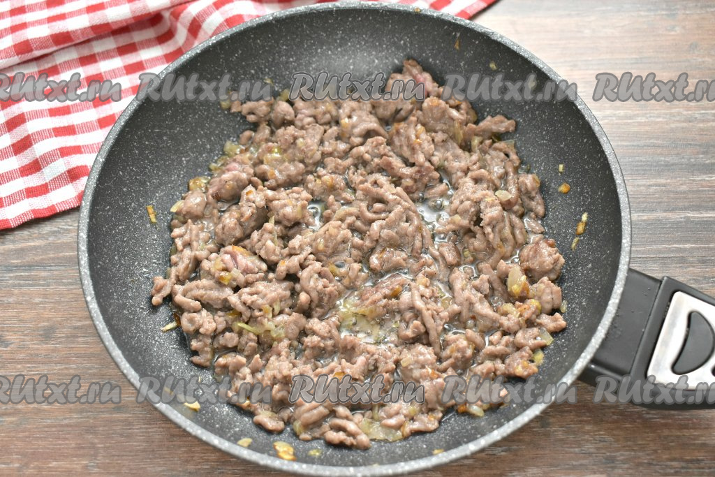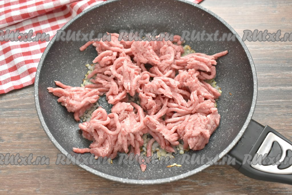 К обжаренному луку добавляем мясной фарш, сразу перемешиваем.