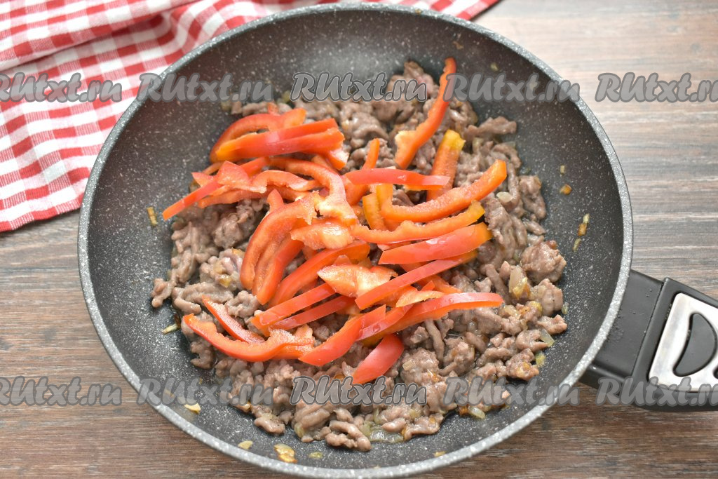 Очищаем болгарский перец от семян, ополаскиваем его водой, нарезаем соломкой и добавляем к фаршу, обжаренному с луком. Перемешиваем, обжариваем фарш с перцем минуты 3, периодически помешивая.