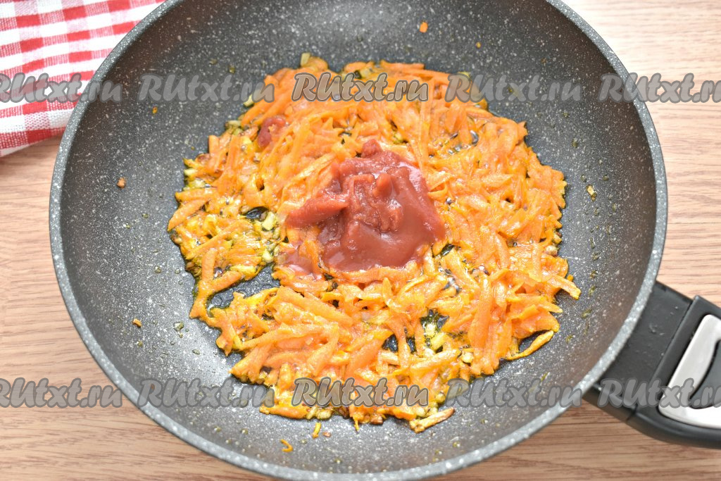 К обжаренным овощам кладём томатную пасту, перемешиваем и готовим минуты 2, помешивая.