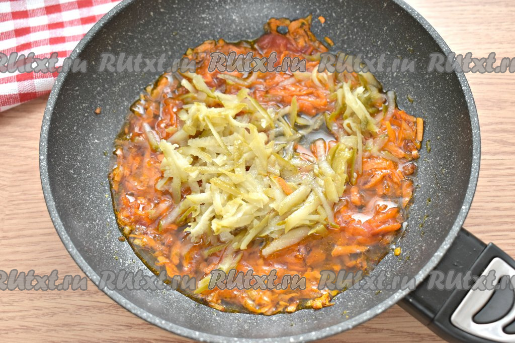 Солёный огурец натираем на крупной тёрке, добавляем к овощам, протушившимся в томате, вливаем огуречный рассол, перемешиваем, доводим до кипения и тушим минуты 3 на минимальном огне.