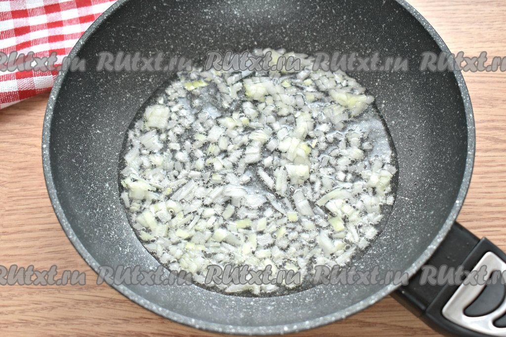 Мелко нарезаем половинку луковицы и выкладываем в сковороду, хорошо прогретую с растительным маслом. Обжариваем лук на умеренном огне, периодически перемешивая, 2-3 минуты (лук должен стать достаточно мягким).