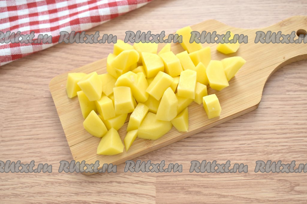 Наливаем в кастрюлю 1,5 литра воды и доводим её до кипения на сильном огне. Очищаем маленькую морковку, половину луковицы и картошку. В закипевшую воду кладём картошины, нарезанные на средние кубики, даём закипеть, а после этого варим на небольшом огне 5 минут.