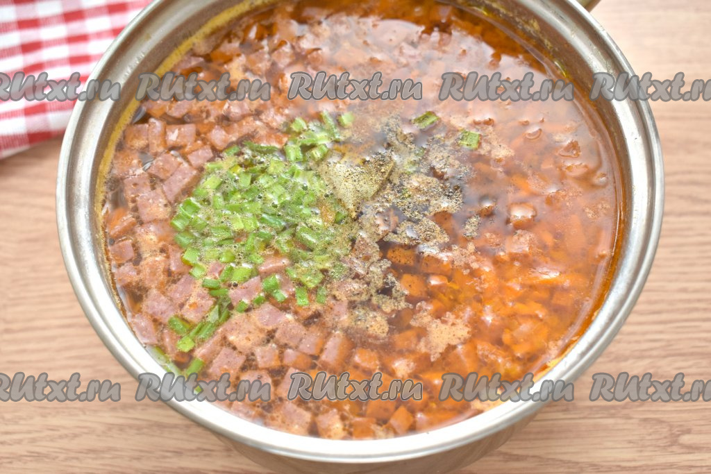 В конце приготовления в рассольник из риса с колбасой добавляем нарезанную зелень (у меня - зелёный лук) и лавровый лист, перчим, даём закипеть, накрываем крышкой, снимаем с огня и оставляем настояться в течение 5-10 минут.