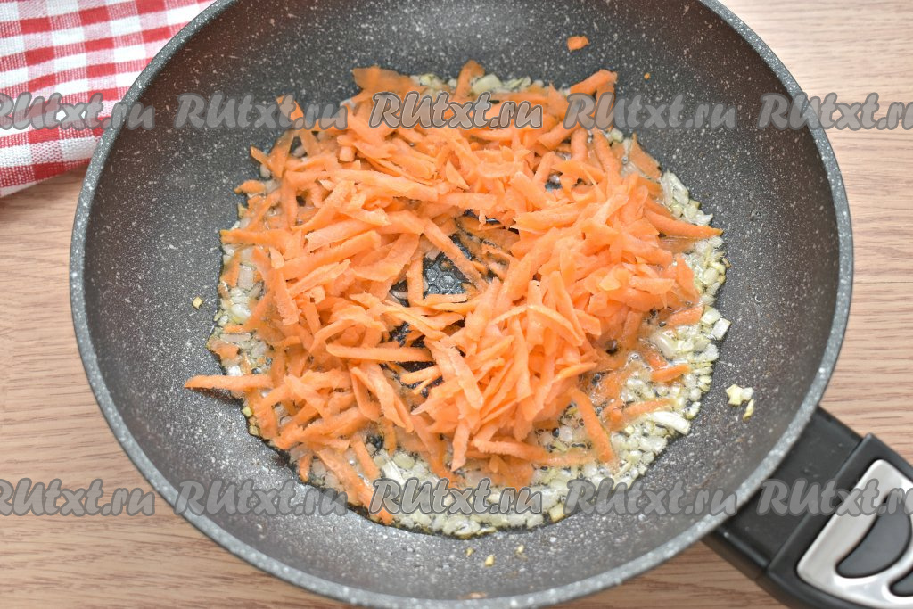 Натираем морковку на крупной тёрке и перекладываем её к мягкому луку, обжариваем овощи вместе 4-5 минут (до мягкости морковки).
