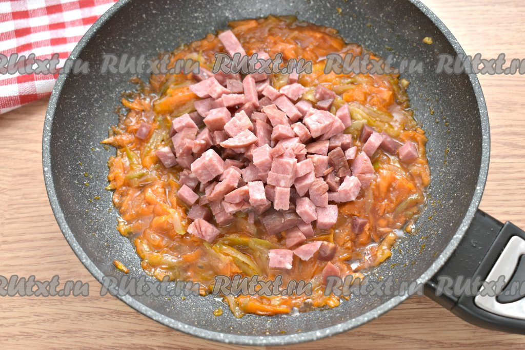 Затем добавляем в сковороду колбасу, нарезанную на маленькие кубики, перемешиваем, томим 3-4 минуты.