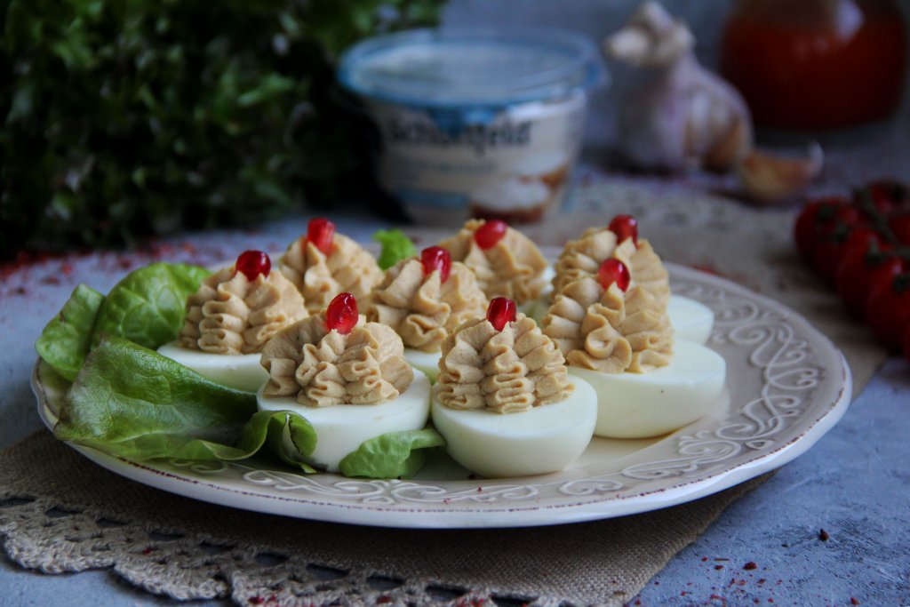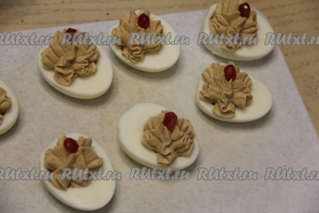 Наполнить получившимся муссом белковые лодочки (или тарталетки). Я выложила мусс в кулинарный мешок с фигурной насадкой и отсадила его в лодочки из белков. Можно намазать мусс на кусочки хлеба, получатся великолепные бутерброды. Перед подачей блюдо можно украсить веточкой укропа или зёрнами граната.
