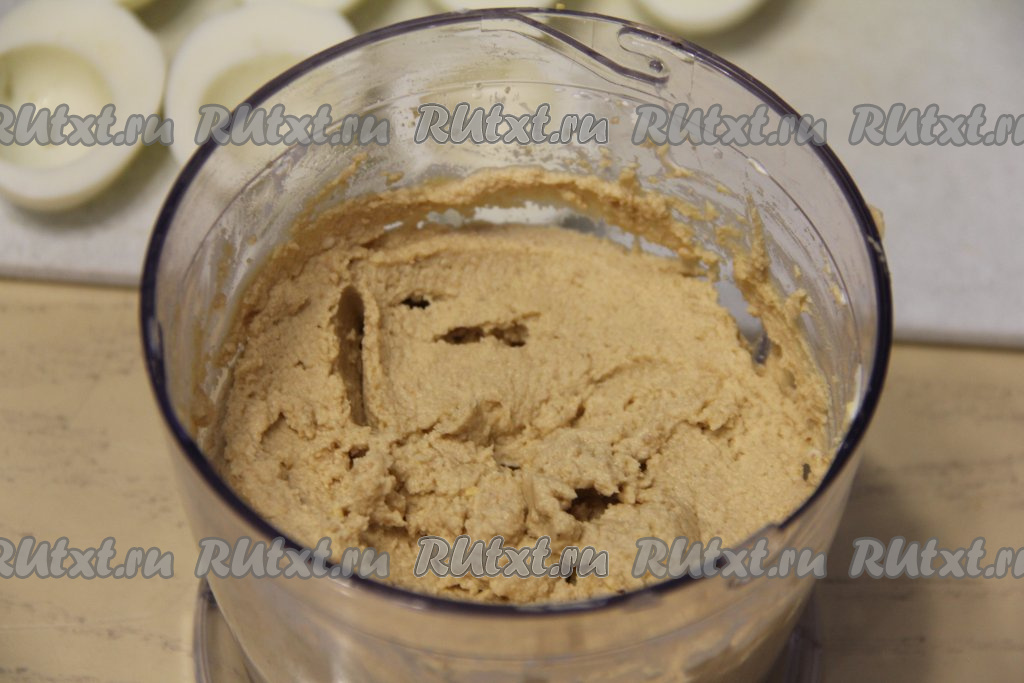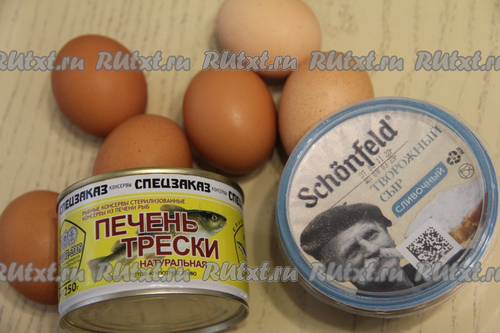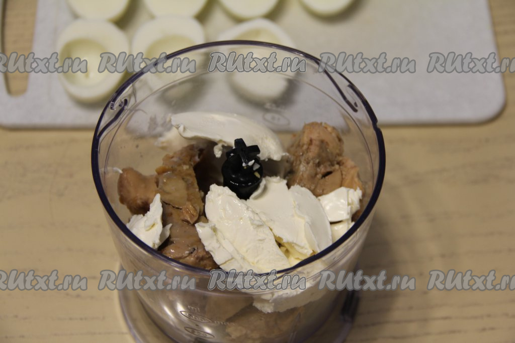 С печени трески слить лишний жир (жир нам не понадобится). Переложить печень в измельчитель, добавить творожный сыр. Очищенные яйца разрезать в длину на две равные половинки. Вынуть желтки и добавить их к сыру и печени. Я фаршировала муссом яйца, поэтому получившиеся лодочки из белка пока отложила в сторону.