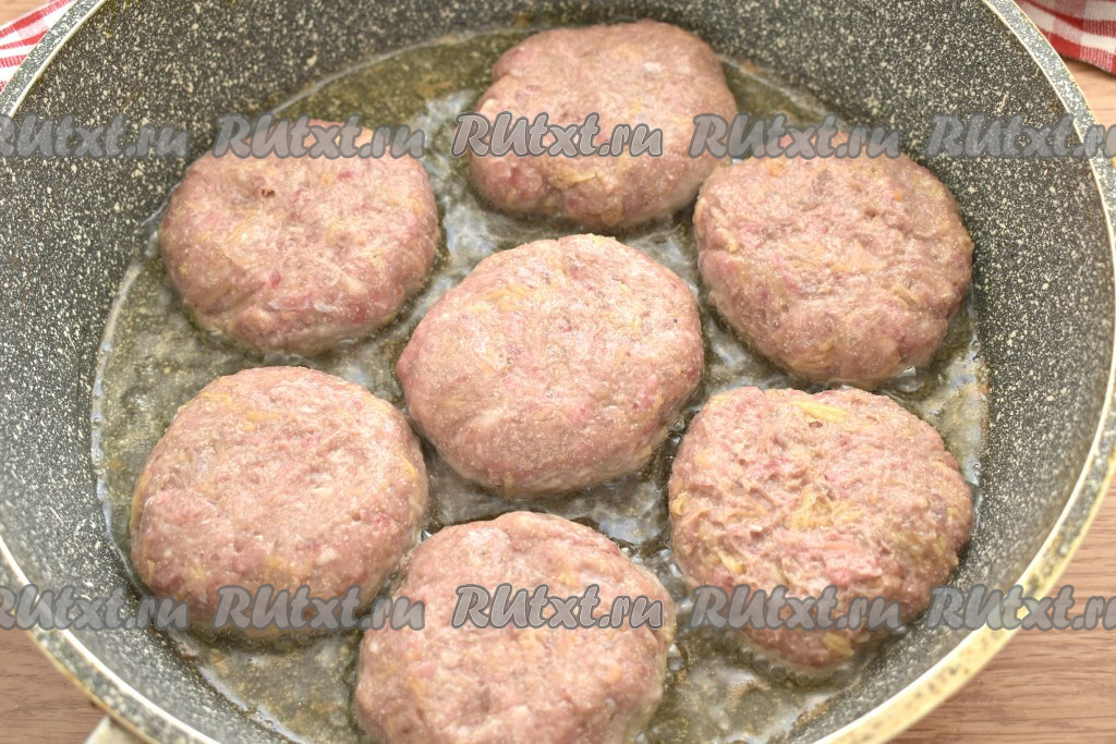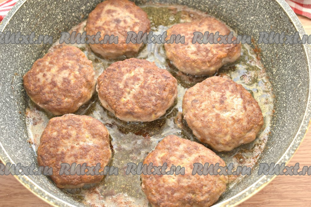 На огне выше среднего жарим котлеты по 5-7 минут с каждой стороны (до румяности).
