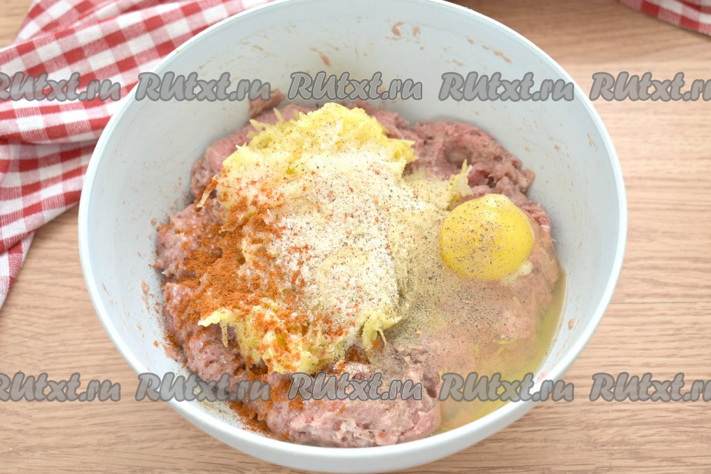 Добавляем яйцо, всыпаем специи по вкусу и солим, тщательно перемешиваем получившийся фарш.