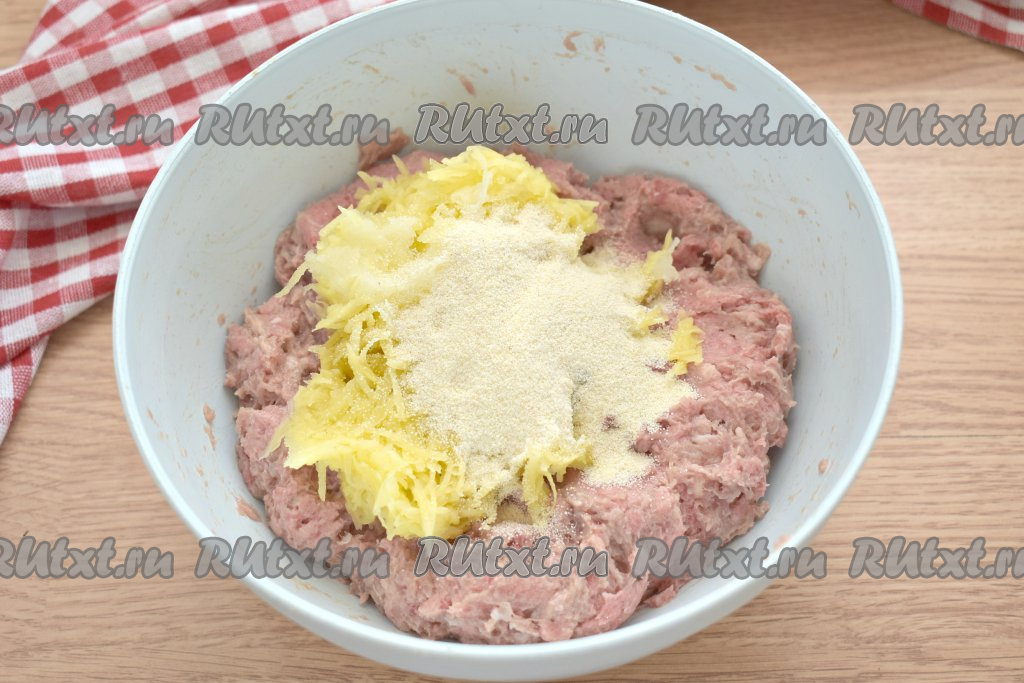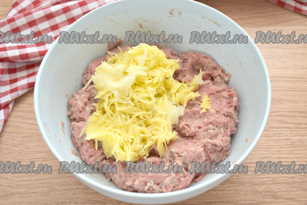 Очищаем картофель, лук и зубчик чеснока. Натираем картошину, луковицу и чеснок на мелкой тёрке, добавляем к фаршу.