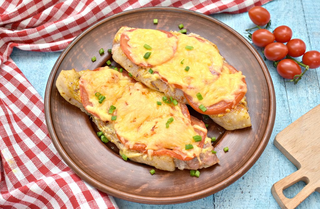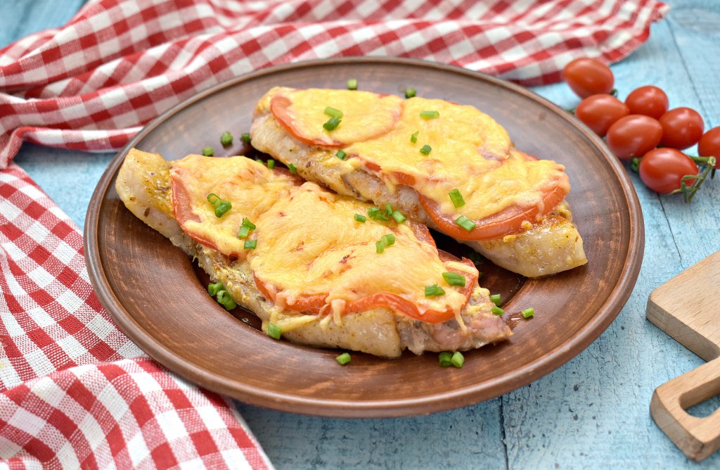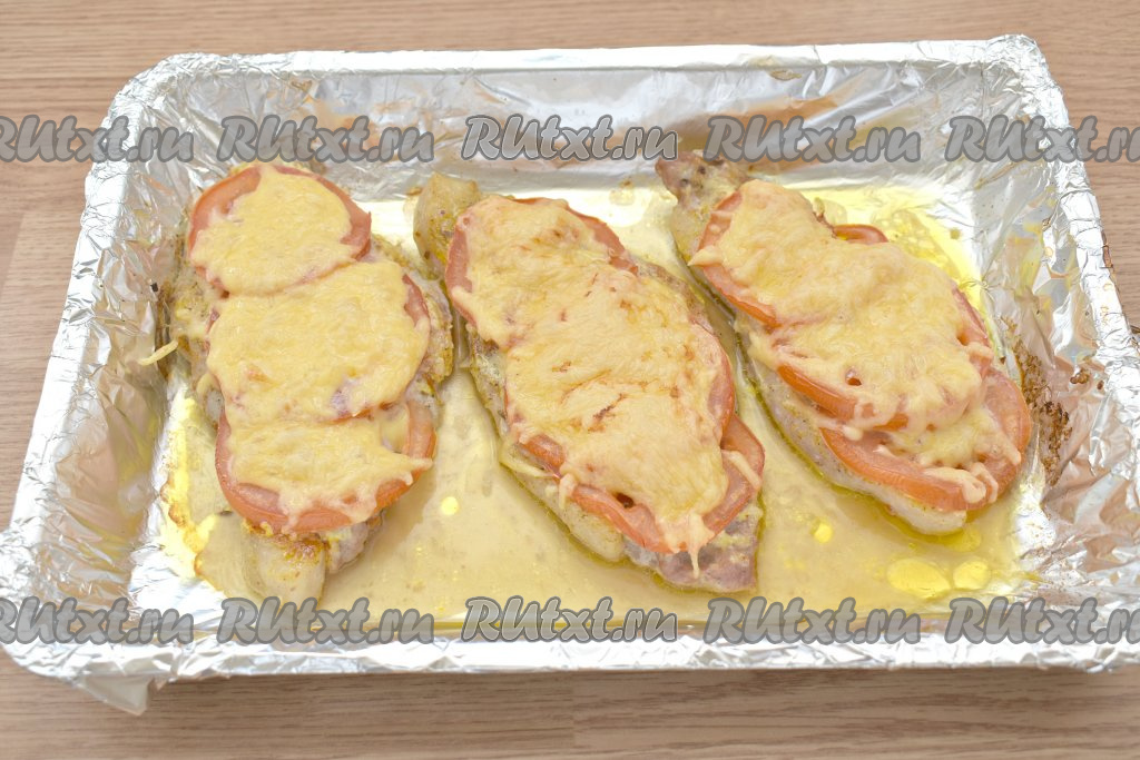 Стейки из свинины с помидорами и сыром достаём из духовки и подаём к столу. Мясо получилось сочным, нежным, с аппетитной сырной корочкой.