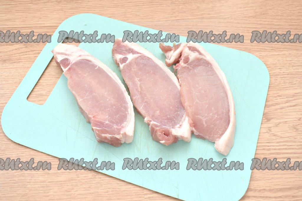 Свинину ополаскиваем водой, обсушиваем, а затем нарезаем вдоль на порционные кусочки шириной примерно 1,5-2 сантиметра.