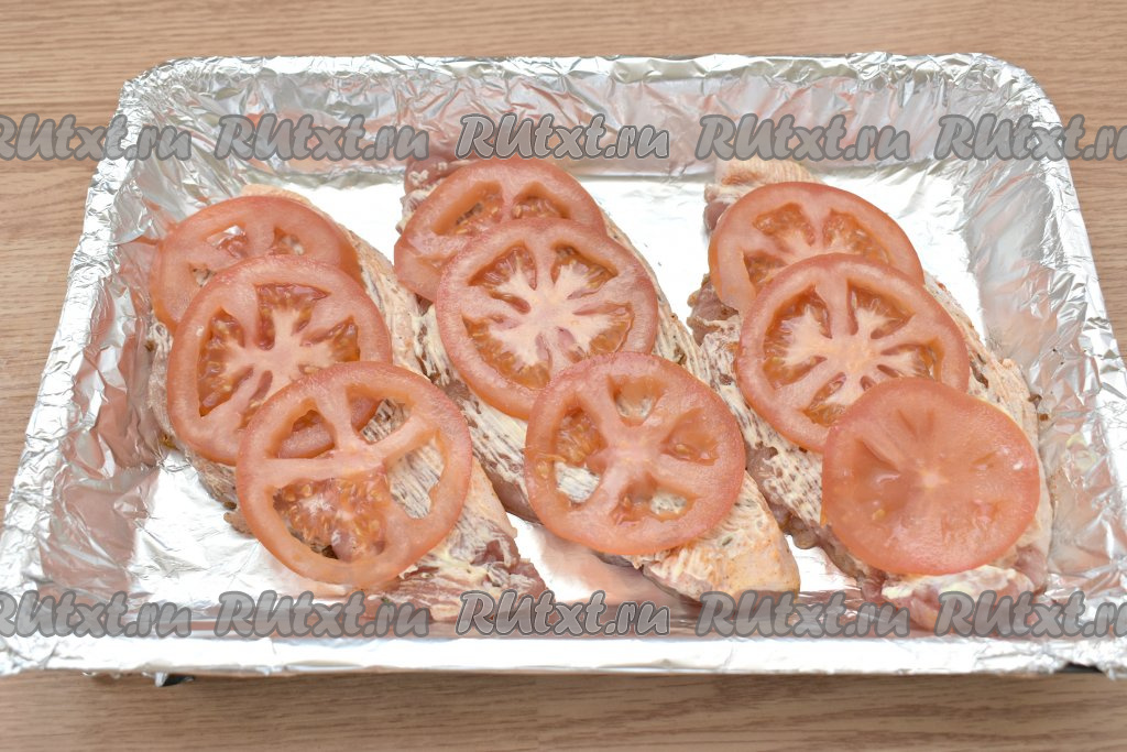 Помидор моем, нарезаем на тонкие кружочки. Выкладываем нарезанные помидоры поверх свинины.