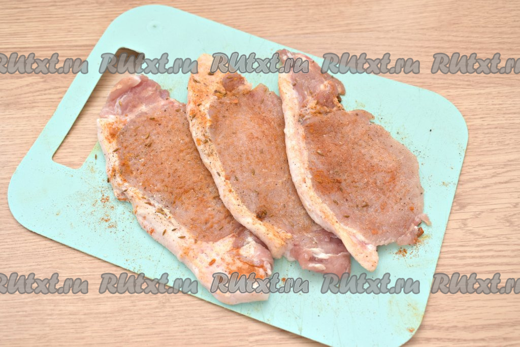 Отбитые кусочки свинины со всех сторон натираем солью, чёрным молотым перцем и приправой для мяса.