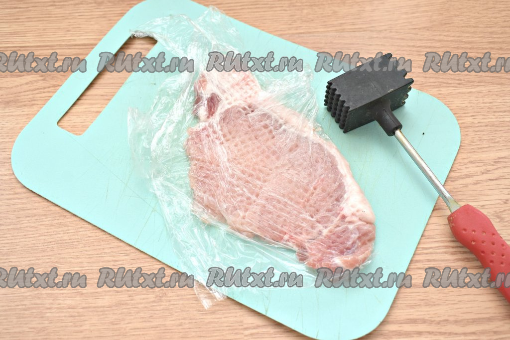 Получившиеся стейки из свинины накрываем пищевой плёнкой и отбиваем молоточком для мяса.