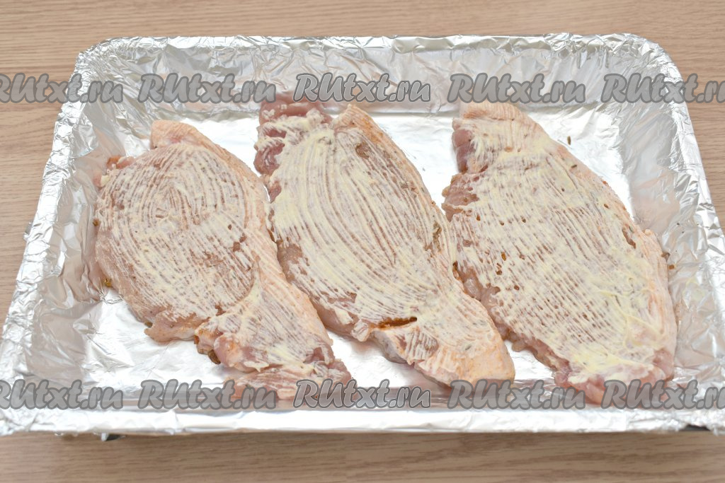 Противень застилаем фольгой, затем смазываем растительным маслом. Стейки выкладываем в форму. Сверху смазываем мясо майонезом.