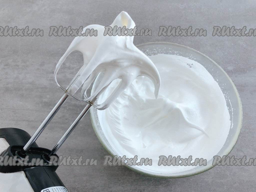 Затем скорость миксера увеличиваем до максимума и постепенно добавляем сахар, не прекращая взбивать миксером. Взбиваем белки на максимальной скорости до появления упругих пиков (у меня на это ушло примерно 3-4 минуты).