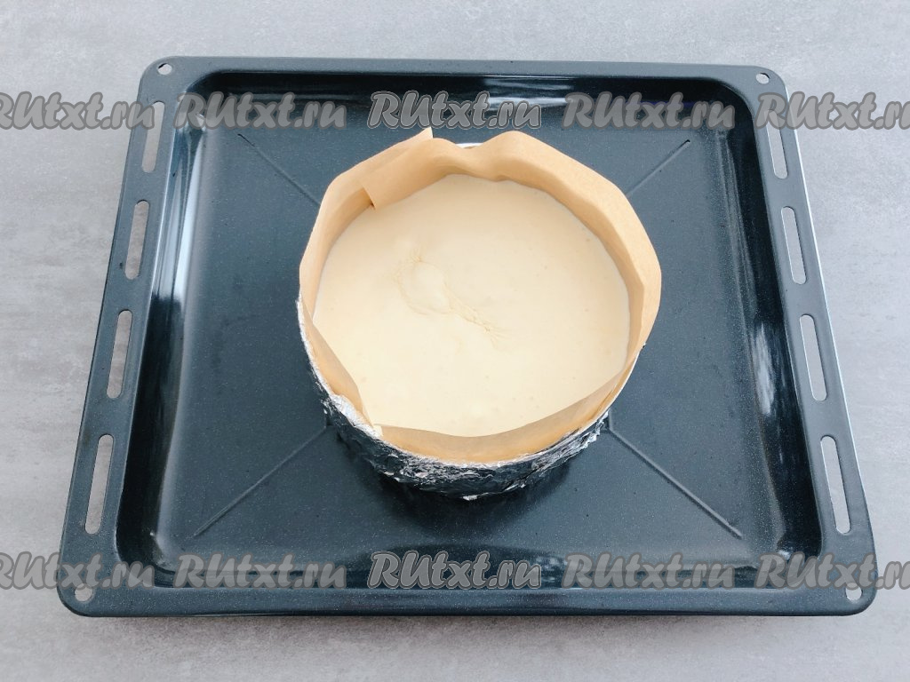 Форму перемещаем на противень и переливаем в неё тесто.