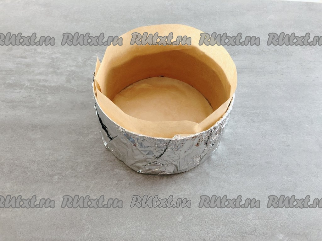 Теперь подготовим форму для выпечки. Я использую раздвижное кондитерское кольцо диаметром 18 сантиметров, высота 8,5 сантиметров. Снаружи его необходимо плотно обернуть фольгой в несколько слоёв, а стенки и дно изнутри выстелить пергаментом для выпечки. Смазывать маслом не потребуется.