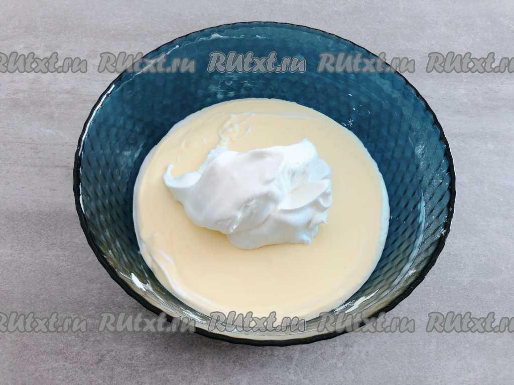 Взбитые белки небольшими порциями выкладываем в чашу с сырно-желтковой массой и аккуратно перемешиваем тесто лопаткой движениями снизу вверх до однородности. Таким образом постепенно вмешиваем все белки.
