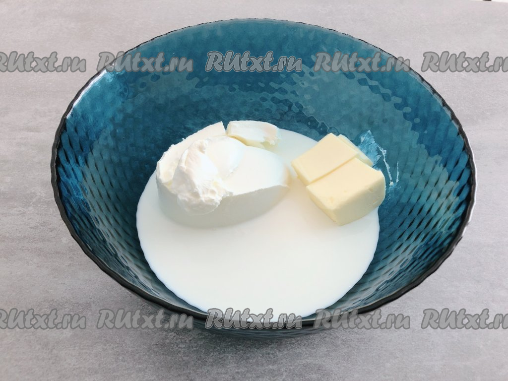 В достаточно глубокой чаше соединяем сливочный сыр, сливочное масло и сливки.