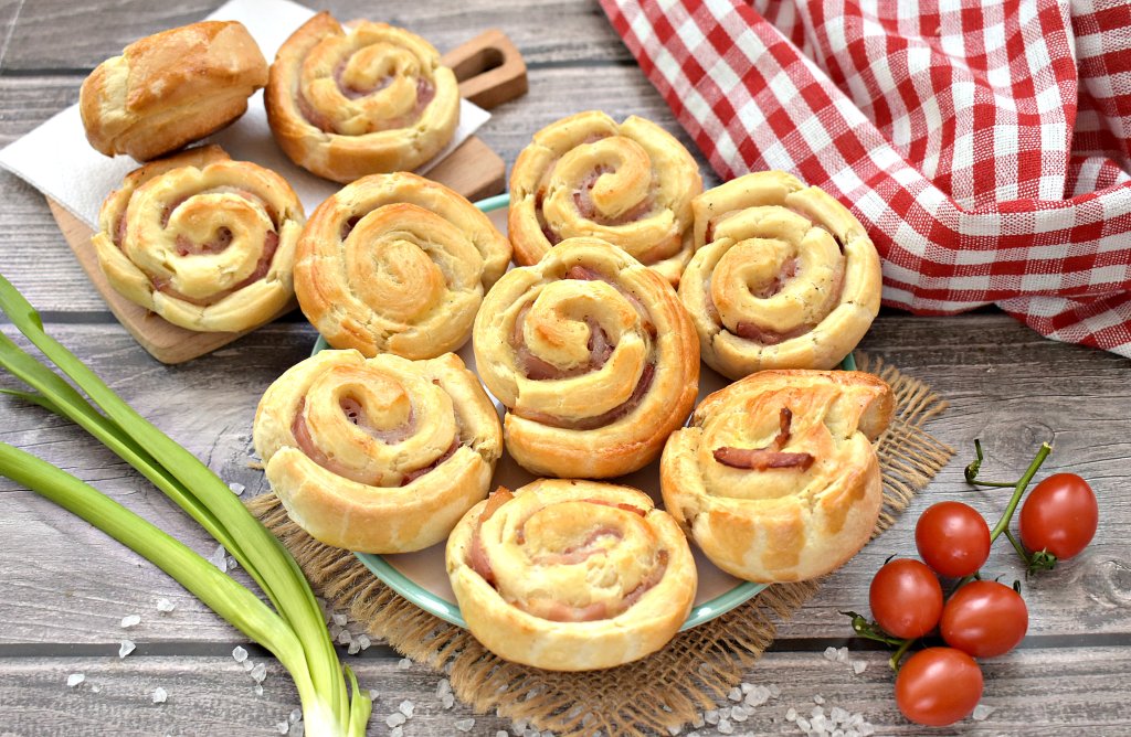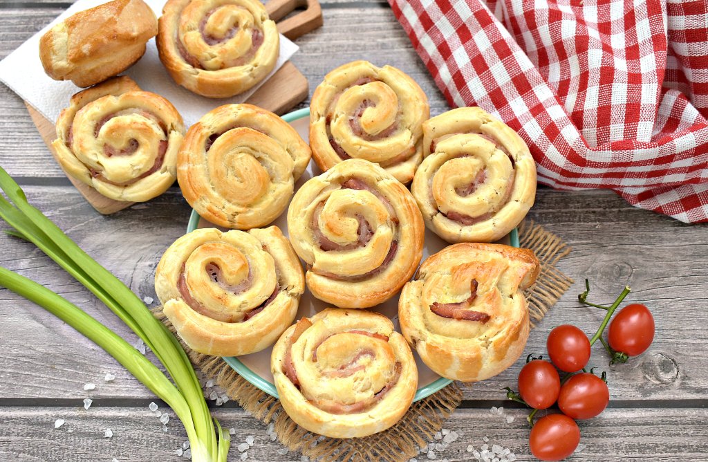Слойки с беконом хороши и в тёплом виде, и в остывшем. Такая выпечка из слоёного теста получается мягкой, сытной и очень вкусной.