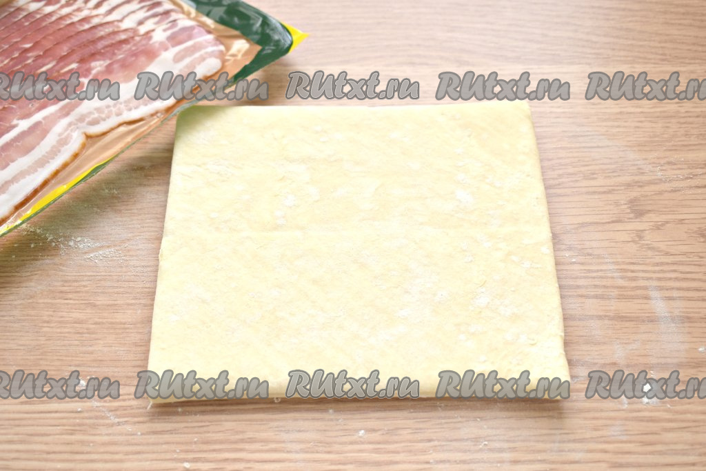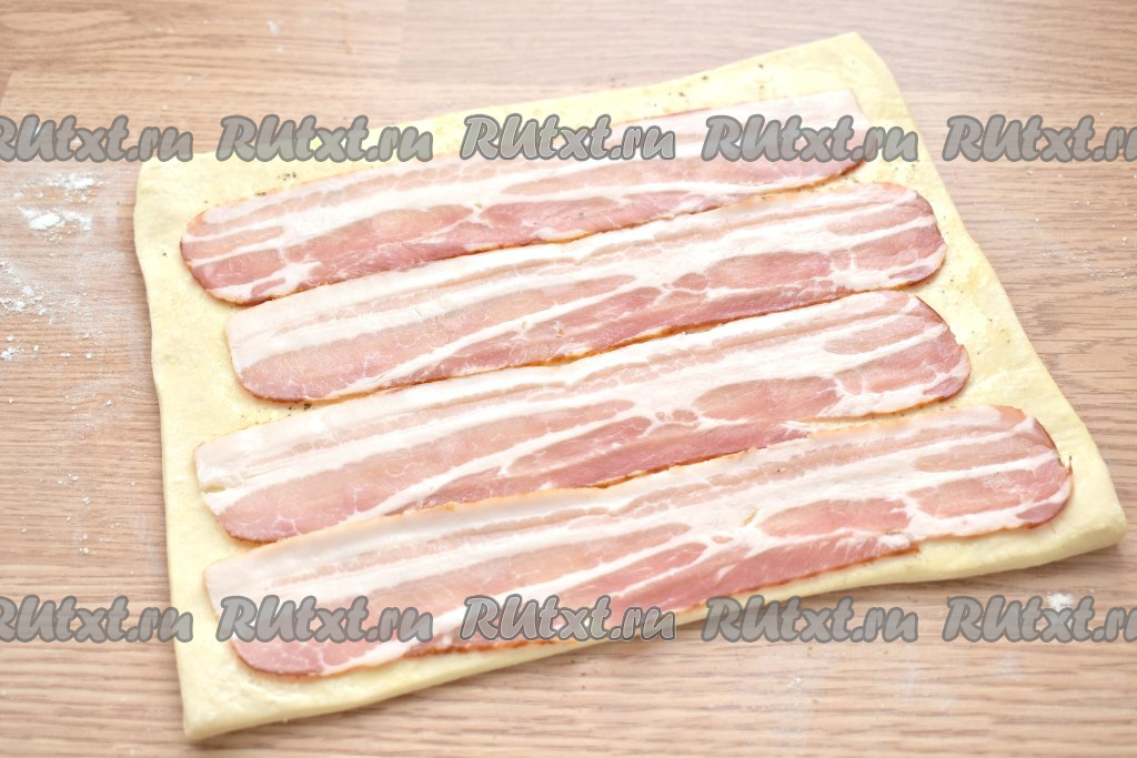 На смазанную поверхность слоёного теста выкладываем полоски сыровяленого бекона.